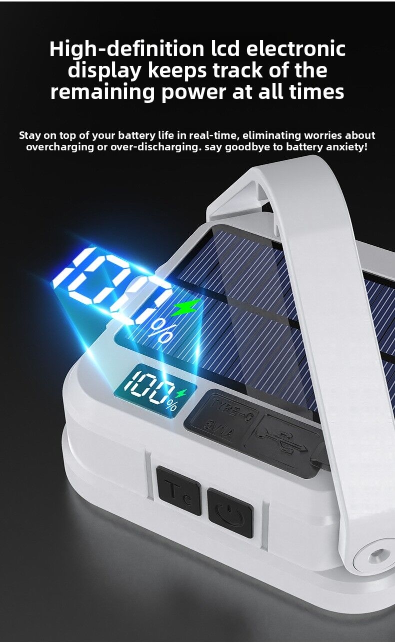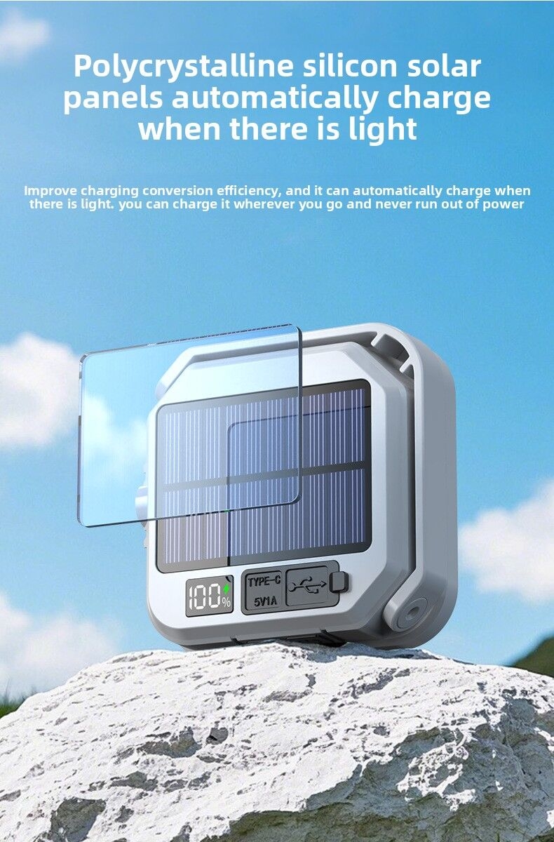 Functions: Supports solar charging - Can charge mobile phones - Battery level display - With hook - With bracket hole