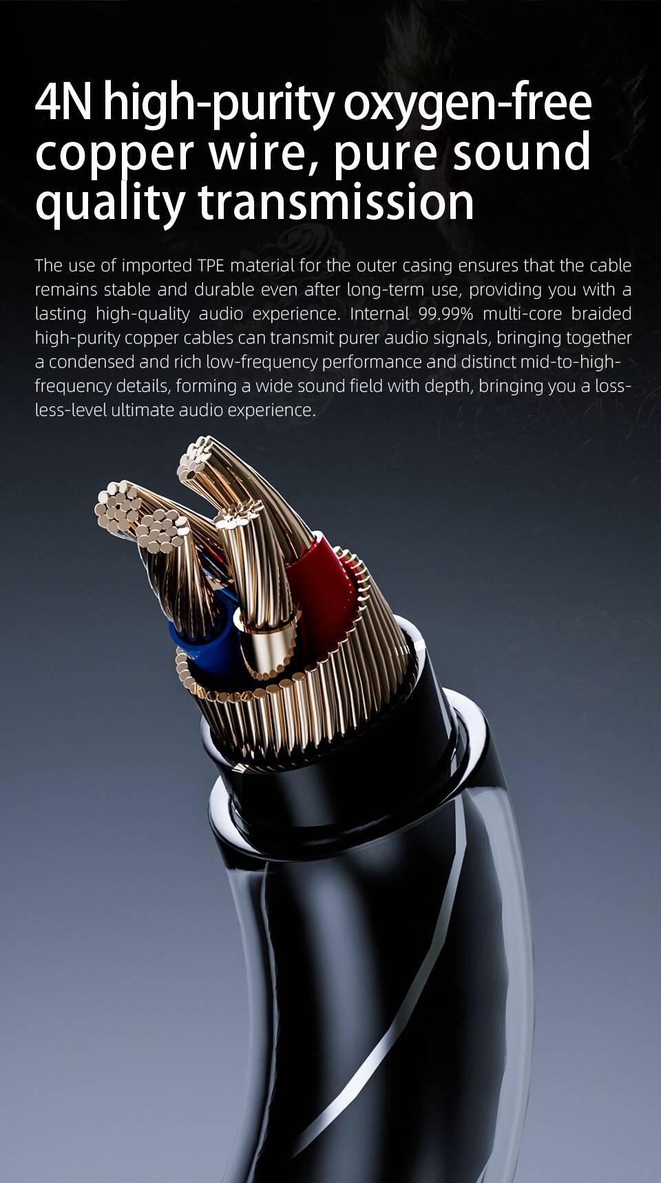 Built with 99.99% multi-core braided copper cables and a durable TPE outer layer, the wire provides stable transmission and reduces signal loss. Experience rich low-frequency depth and precise mid-to-high frequency details for a true high-fidelity experience.
