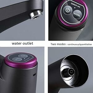 | COMPACT SIZE Measuring less than 15 cm in both height and length, this compact yet powerful water bottle pump is easy to use both indoors and outdoors. It's perfect for RVs or camping. | LONG LIFE BATTERY USB Rechargeable Battery: Built in rechargeable 1200mAh battery. Can used for 30 days or around 4-6 bottles of 5 gallon water once full charged. No need to charge every day. | DETAILED WORKMANSHIP The NEW design does NOT use Stainless Steel pipe. No need to worry about missing the pipe no more. The metallic finish makes the pump looks sleek and exceptional |