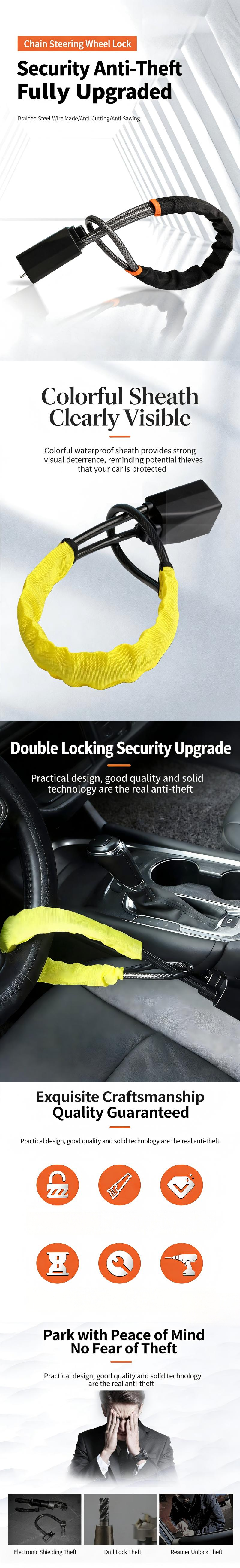 Innovative Steering Wheel Lock: Lock the steering wheel and seat belt base at the same time for double anti-theft protection, better than just locking the steering wheel (the lock cord can also be threaded through other items and locked together for protection)