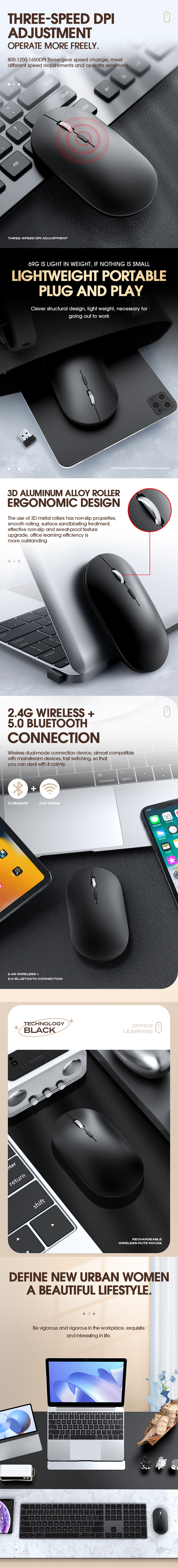T-WOLF X2 Rechargeable 2.4G+ Bluetooth Wireless Silent Mouse, compatible with laptops and desktops, dual-mode connection - Black