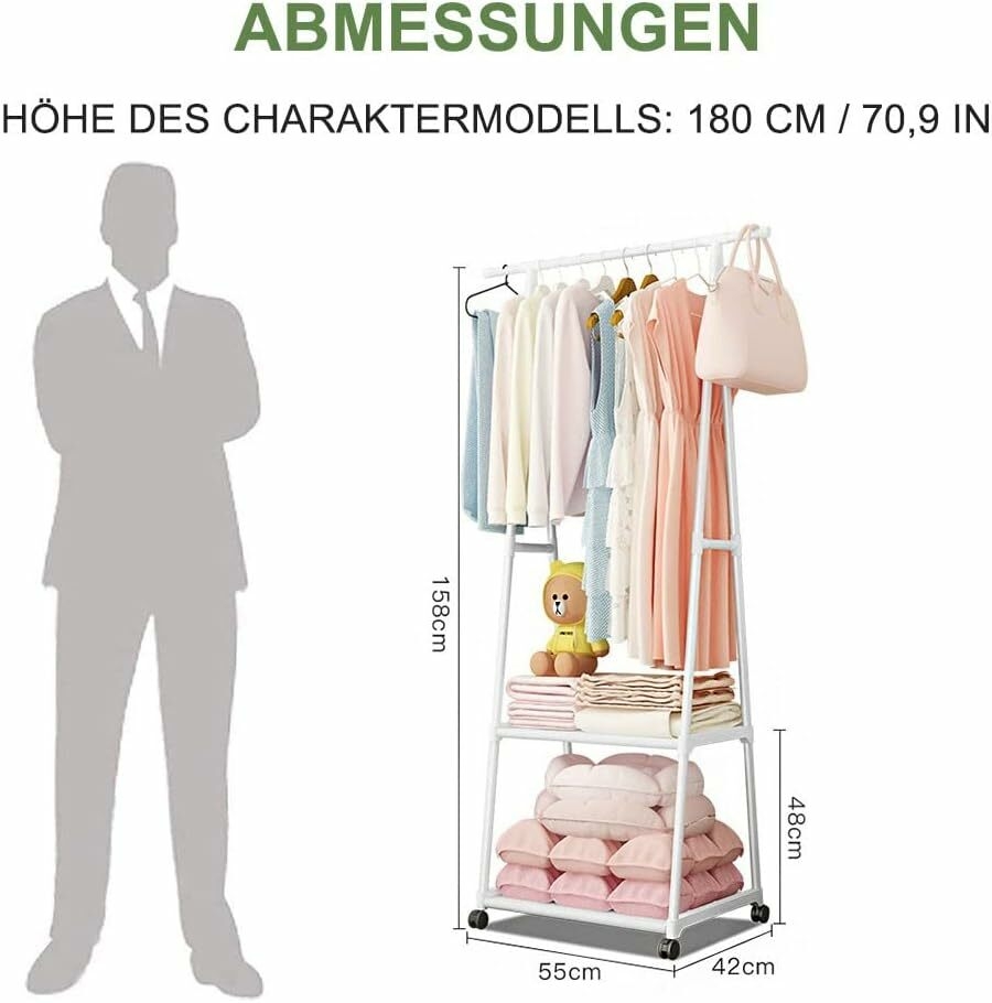 •  Extra Storage and Moving Shelves:The bottom grid shelf can hold shoes or boxes to create extra storage space, and there are four 360° wheels at the bottom for easy movement. There are also four hooks for hanging clothes, pants, hats, bags and other items.