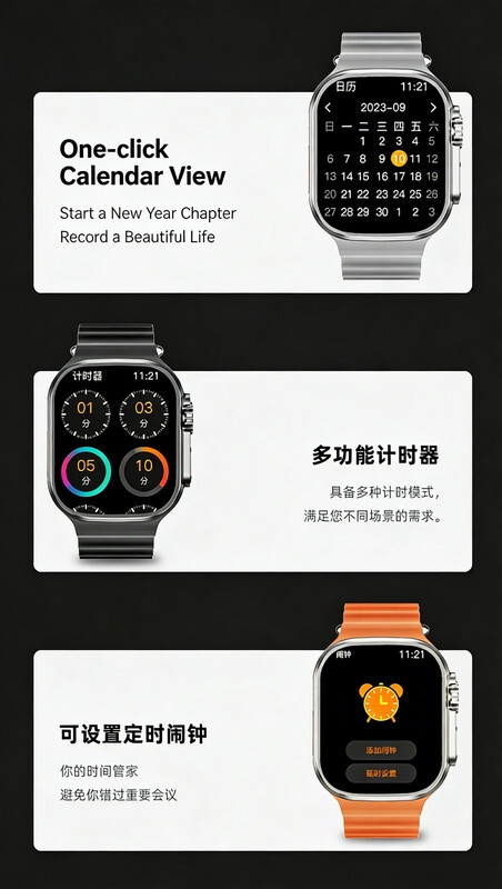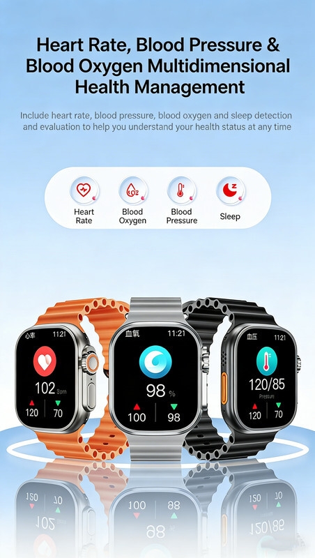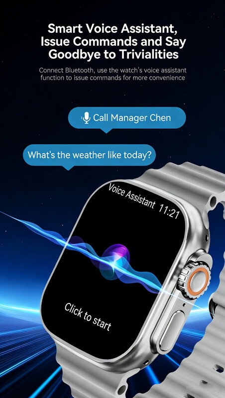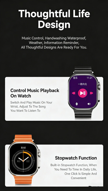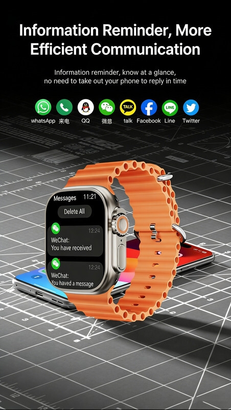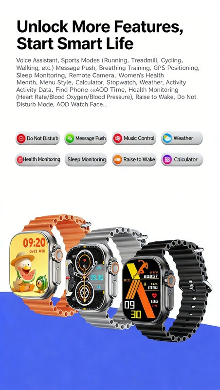 Easy Operation: The user-friendly interface and intuitive controls make navigating the 7 in 1Smart Watch Ultra effortless. Access your favorite apps, receive notifications, and control your music with just a few taps on the responsive touchscreen.