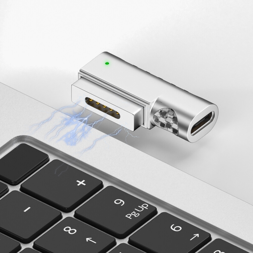 Type-C To Magnetic 2 Charging Adapter with Charging Indicator Light Charging Magnet Plug Converter 18.5V-20V for MacBook Air/Pro Feature: 1. High Quality: Adopting a high-quality zinc alloy shell, the product heats up faster, is safe and durable, easy to carry, and the plug is firm; The joint is treated with nickel plating, which is resistant to oxidation and does not blacken. The magnetic suction interface has strong suction and is not easy to fall off, protecting the laptop from stable charging. 2. Built-in PD Chip: Supports PD charging protocol, automatically recognizes device current and voltage, and is compatible with charging safety protection computers downwards. 3. Support 18.5-20V/5A Maximum Charging Efficiency: C-type PD fast charging technology can provide faster charging speed for laptops, tablets, and smartphones. Devices that support for MacBook USB C ports. 4. Convenient Design: 90 ° side bend design, very suitable for laptops and mobile phones. Suitable for people who frequently change office locations. Type-C to Magnetic 2 paired with PD fast charging device, immediately charge for Apple laptops. 5. Equipped with a Charging Indicator Light: Intelligent reminder of charging status, safe and reliable. (Orange indicates charging, green indicates charging is complete).