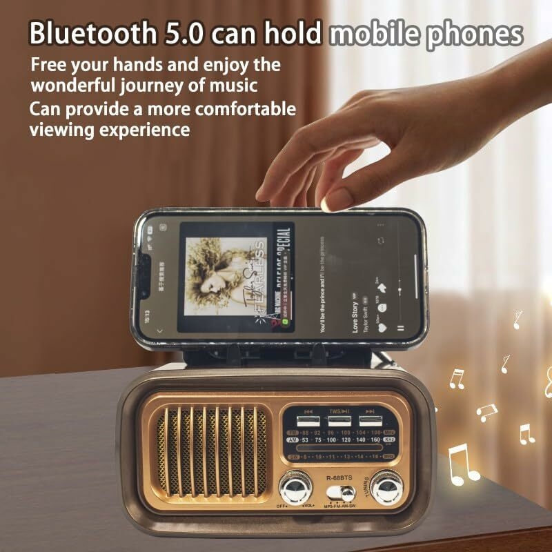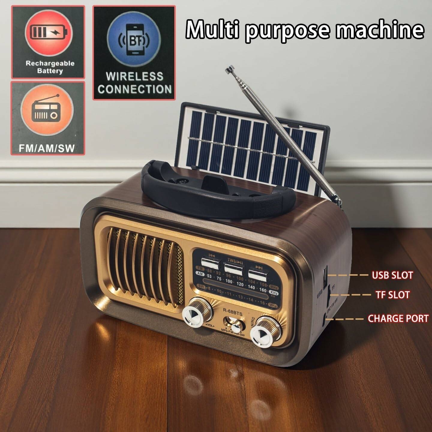 Vintage Portable Radio with Bluetooth & TWS, Solar/D Battery/USB Charging, MP3 Player