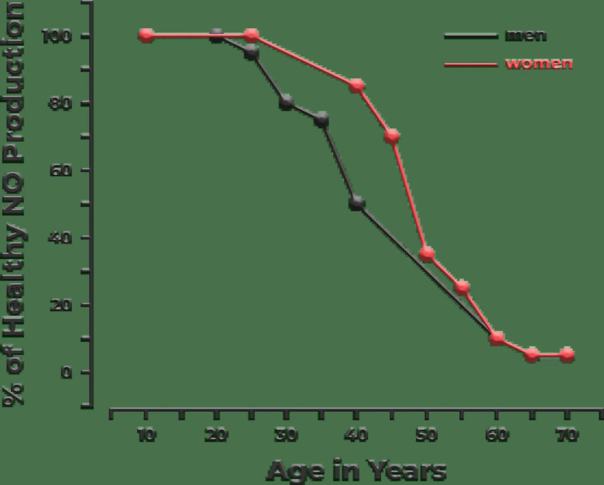 Did you know that starting in your 30’s nitric oxide (N0) production begins to decline by 20% every 10 years and most people over the age of 65 have lost 85% of their ability to make NO.