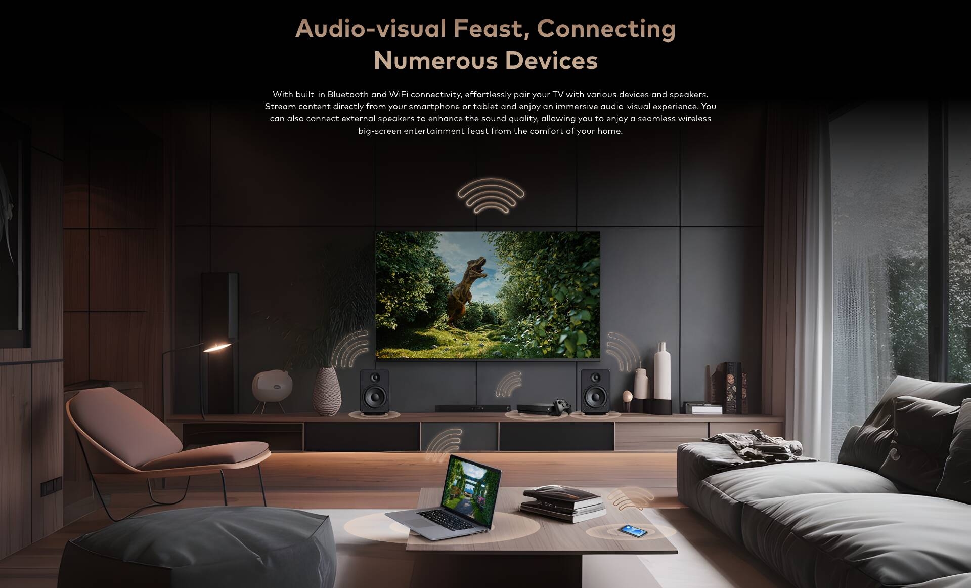 With built-in Bluetooth and WiFi connectivity, effortlessly pair your TV with various devices and speakers. Stream content directly from your smartphone or tablet and enjoy an immersive audio-visual experience. You can also connect external speakers to enhance the sound quality, allowing you to enjoy a seamless wireless big-screen entertainment feast from the comfort of your home.