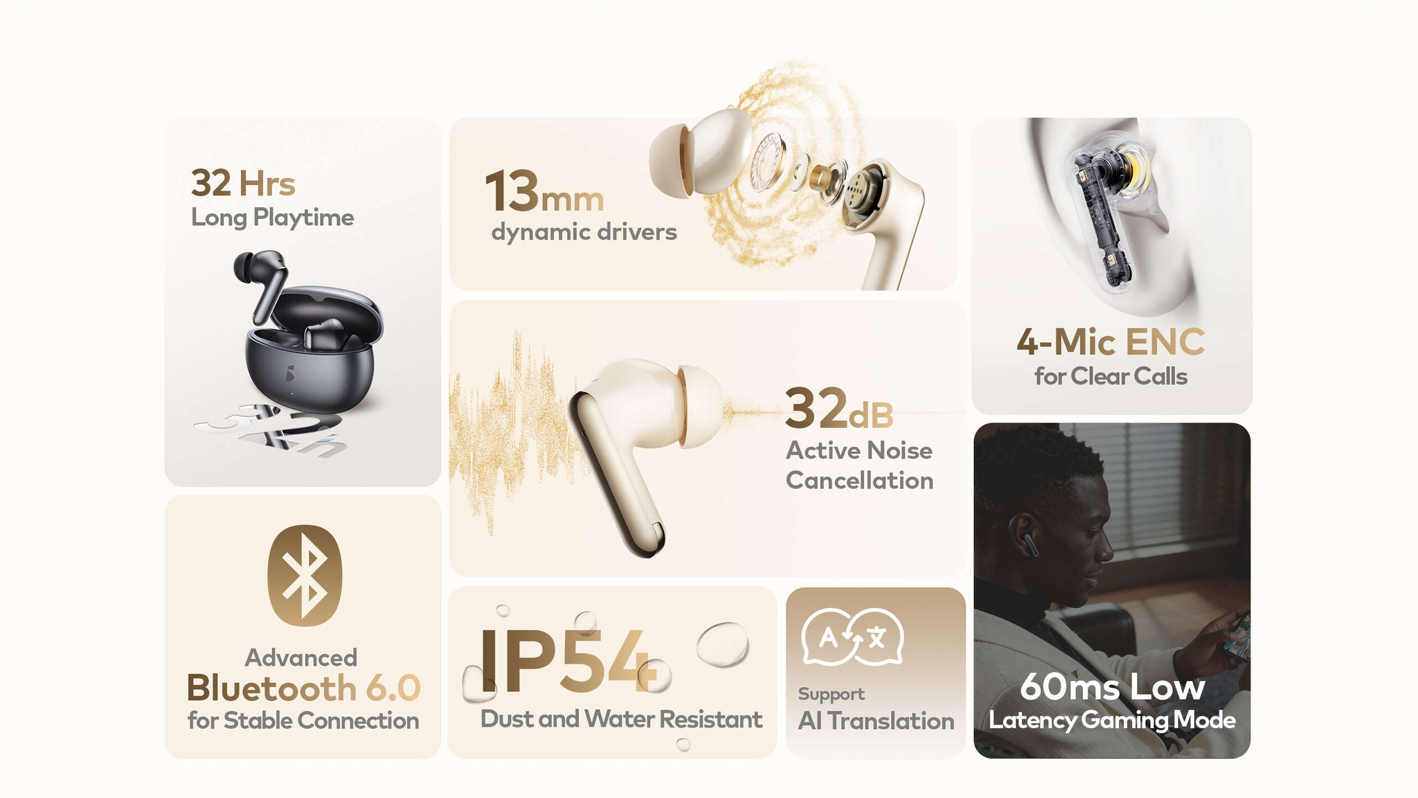 32 dB Active Noise Cancellation creates a space of your own, turning the world down to a soft whisper.