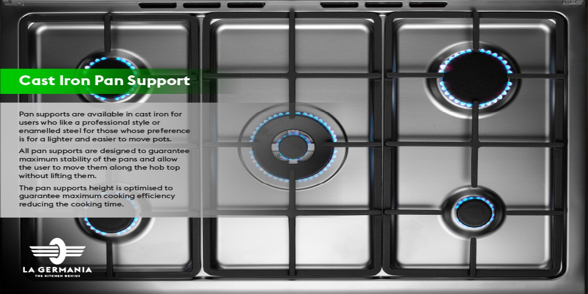 Equipped with 5 High-Quality Italian Gas Burners (100%), including a Central Double Ring Burner (+4 KW), this cooker offers powerful, precise heating for all cooking needs — from gentle simmering to intense searing. The Large Enameled Pan Support ensures stability and durability, while Full Safety and One-Hand Ignition on the hob guarantee easy and secure operation.
