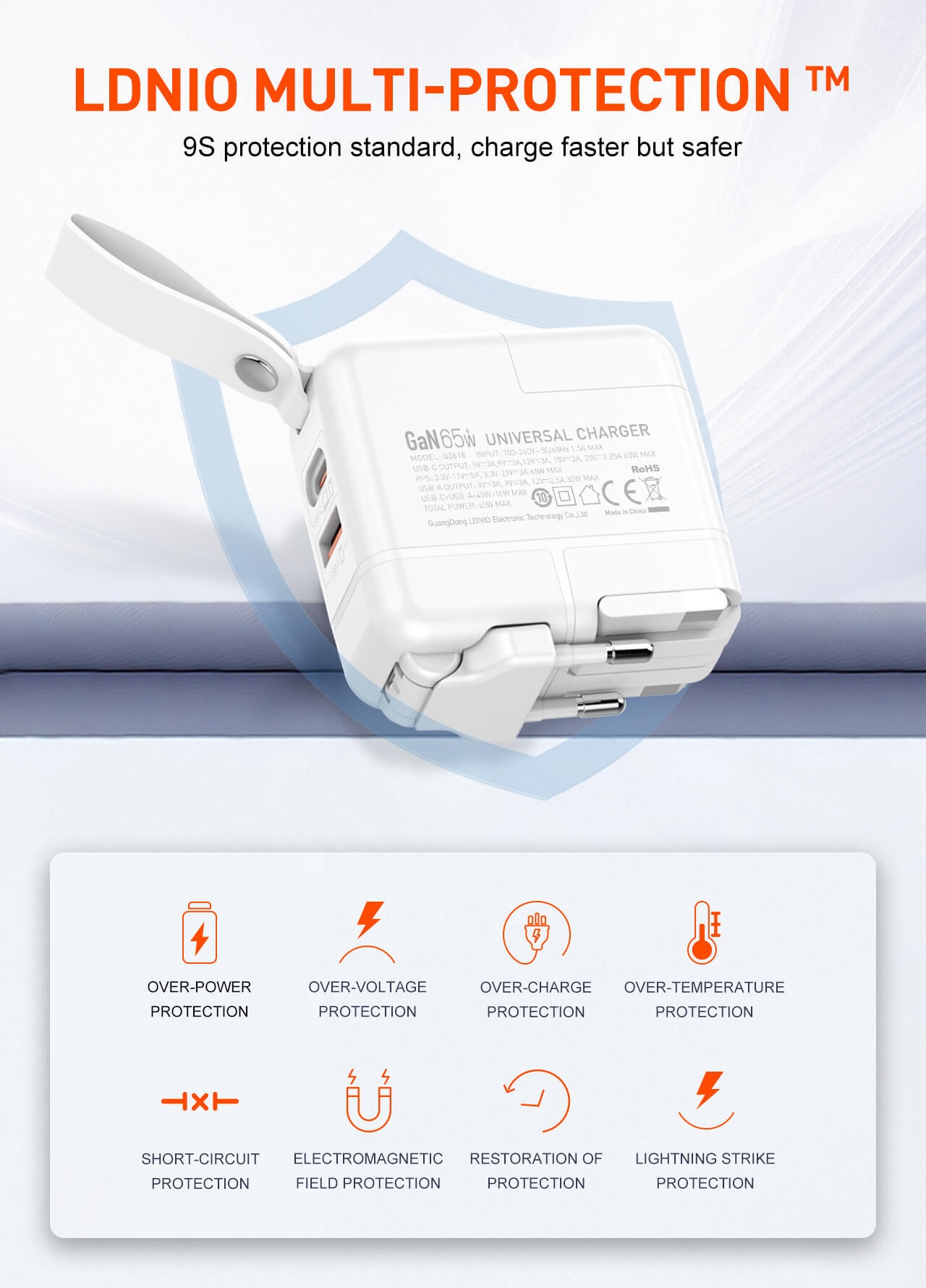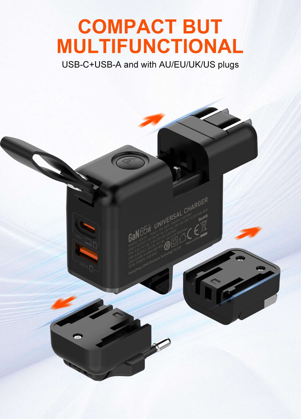 GaN high tech, faster, smaller. USB-C+USB-A Fast Charging, up to 65W .