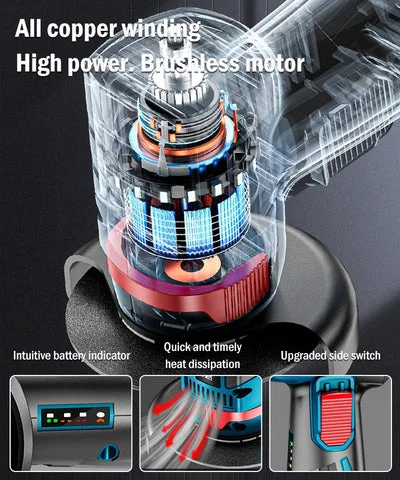 The all-copper BRUSHLESS motor makes our angle grinder more efficient. It has lower wear, lower energy consumption, low interference and longer life. More and more professionals and DIYers are heading to brushless motor to enjoy the longer runtime and more stable operation.