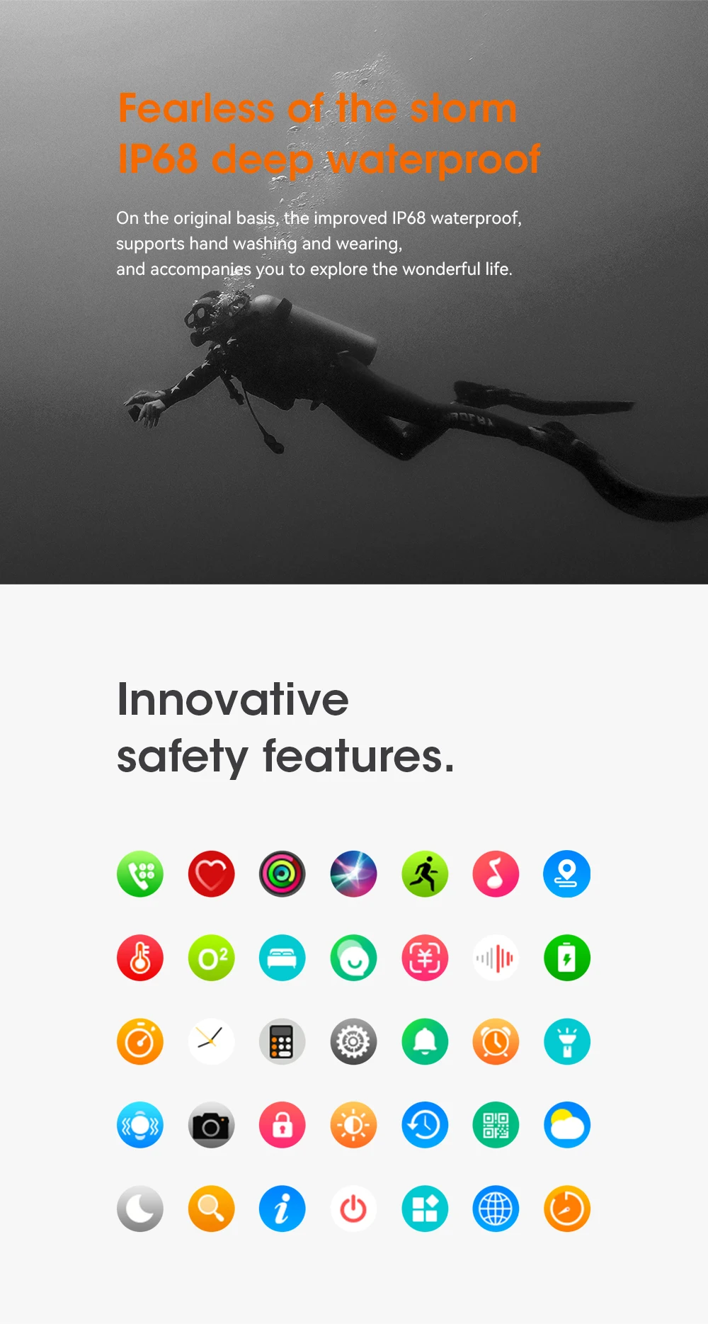 500+ watchfaces free download, wireless charging, Bluetooth call, IP68 waterproof, voice assistant, NFC access control, independent ringtone, independent clock, Always ON screen, bedside lamp, female physiology, body temperature, heart rate and ECG, blood pressure, blood oxygen, sleep, step counting, Bluetooth camera, Bluetooth music, friends, payment code, calculator, phonebook, weather, stopwatch, timer, alarm , Pinlock, flashlight, massage.