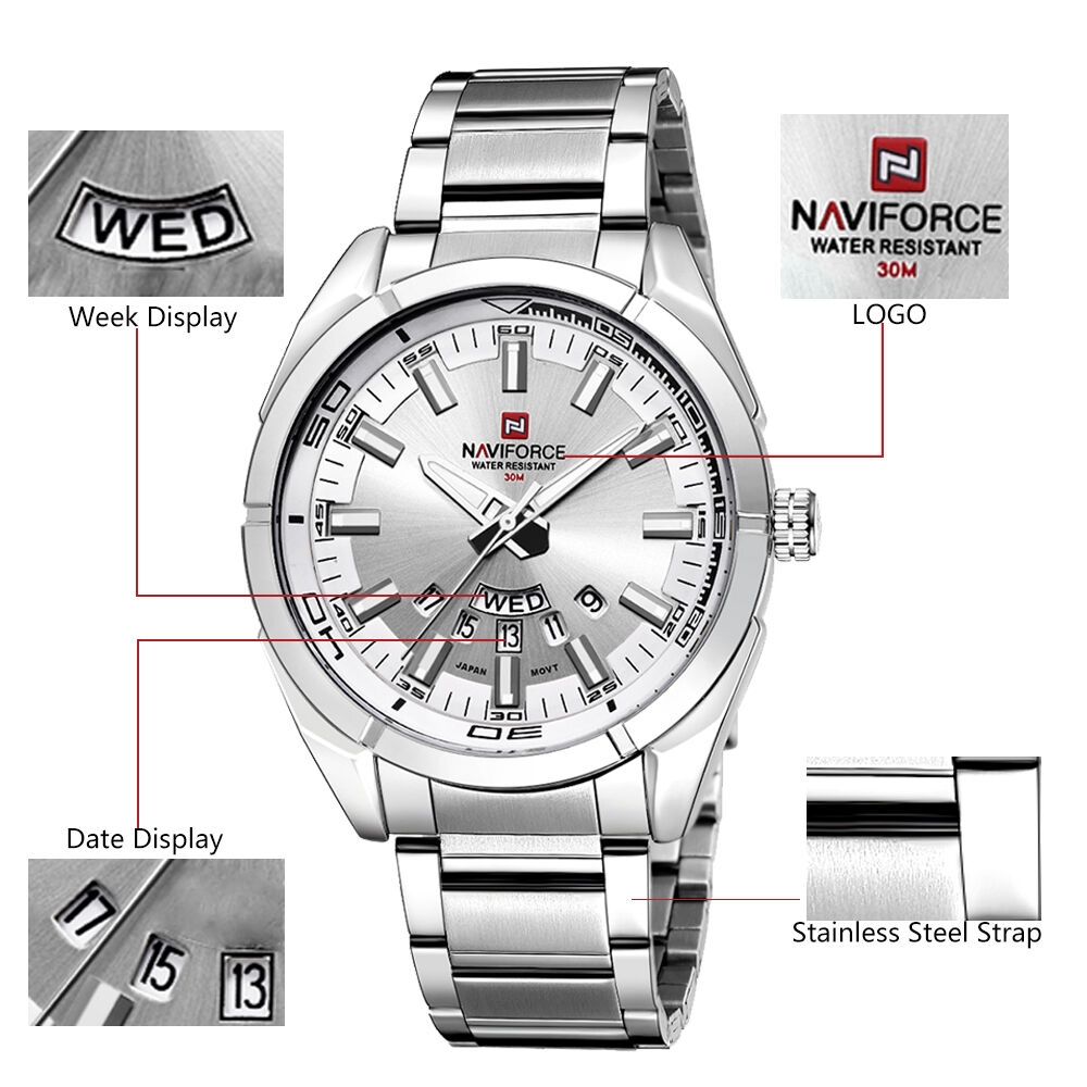 SpecificationsSKU: NA450FC3MTUUDNAFAMZModel: Naviforce-32Size (L x W x H cm): 20 x 10 x 10Weight (kg): 0.23Color: SilverMain Material: alloy