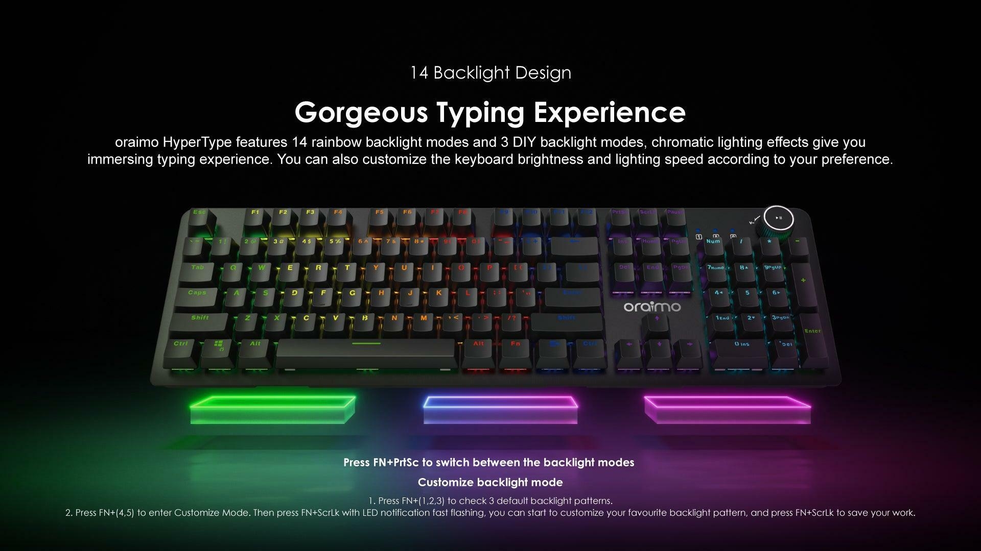 oraimo HyperType features 14 rainbow backlight modes and 3 DIY backlight modes, chromatic lighting effects give you immersing typing experience. You can also customize the keyboard brightness and lighting speed according to your preference.