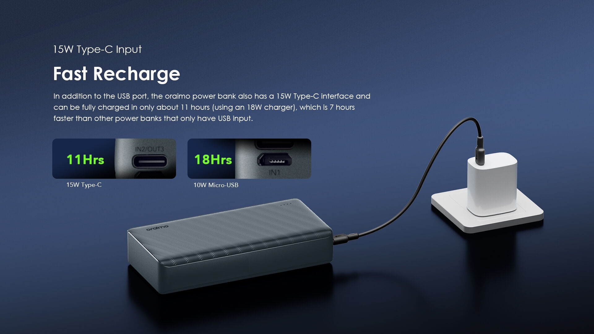 In addition to the USB port, the oraimo power bank also has a 15W Type-C interface and can be fully charged in only about 13 hours, which is 5 hours faster than other power banks on the market that only have the USB input.