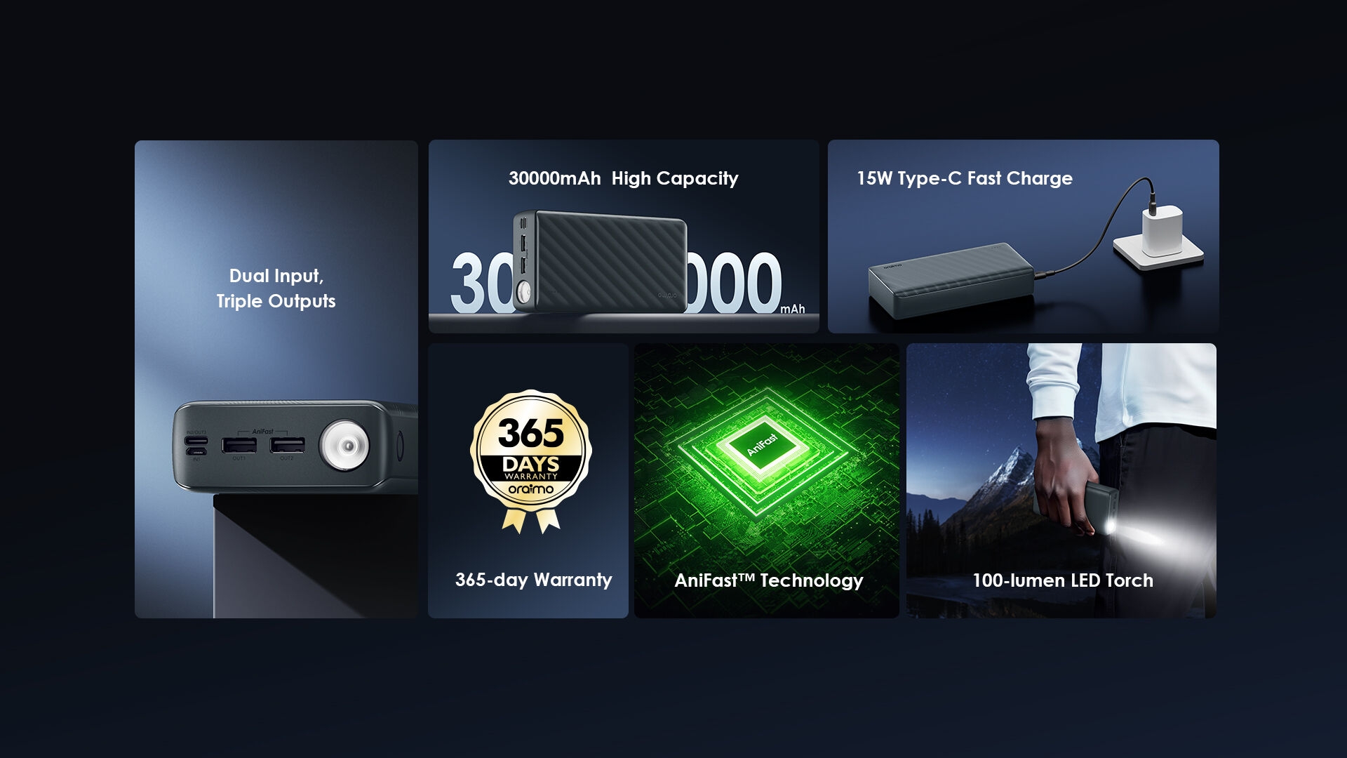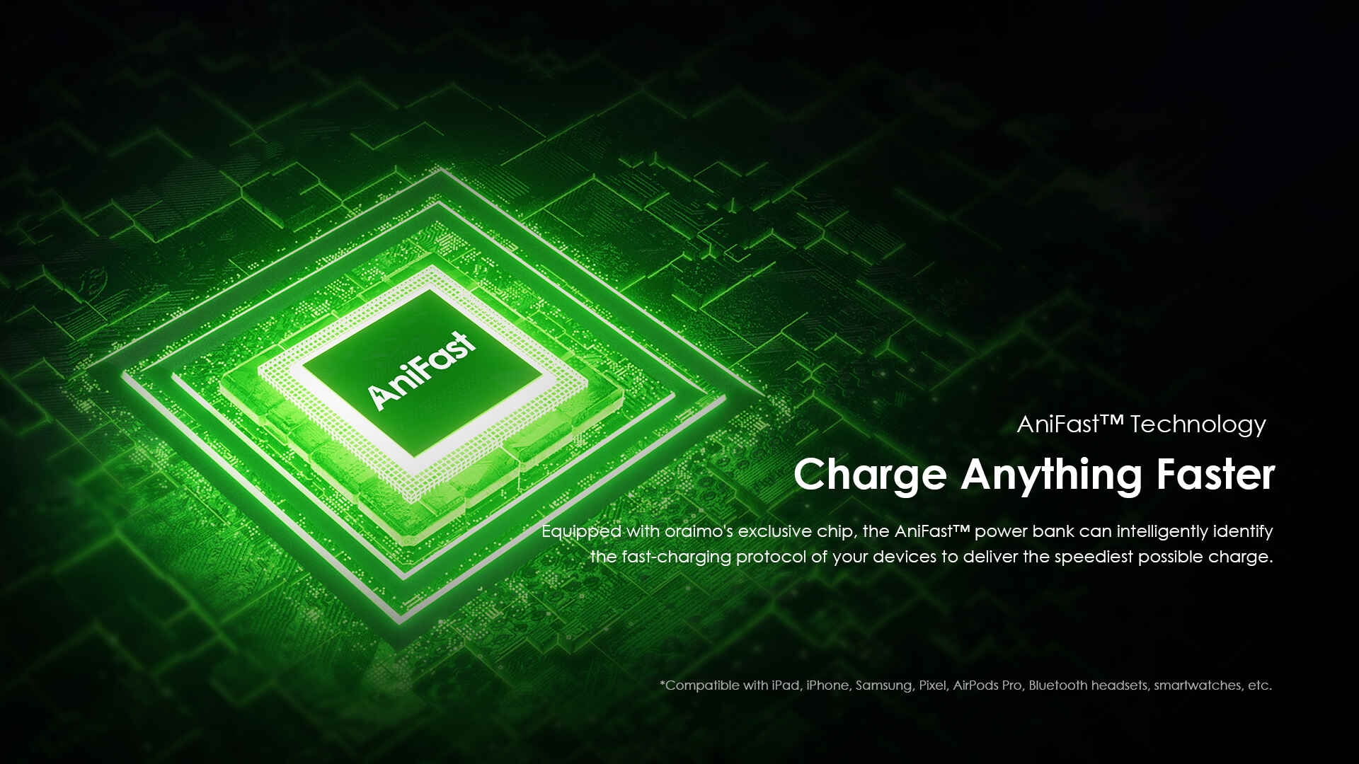 Equipped with oraimo's exclusive chip, the AniFast™ power bank can intelligently identify the fast-charging protocol of your devices to deliver the speediest possible charge.