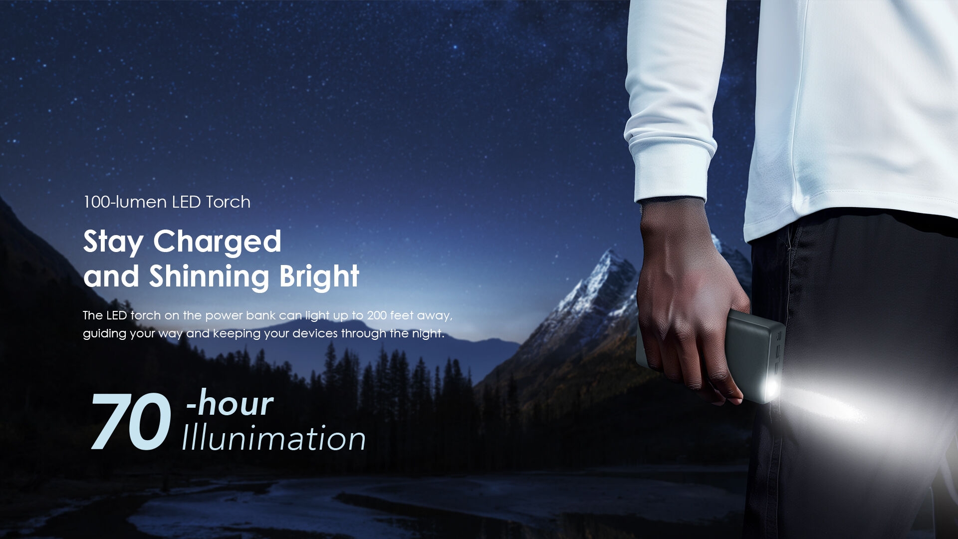 The LED torch on the power bank can light up to 200 feet away, guiding your way and keeping your devices through the night.