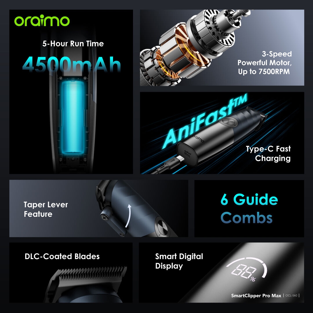 oraimo SmartClipper Pro Max features three-speed settings, making it suitable for all hair types. The powerful motor reaches up to 7500RPM, delivering smooth, and effortless haircuts.