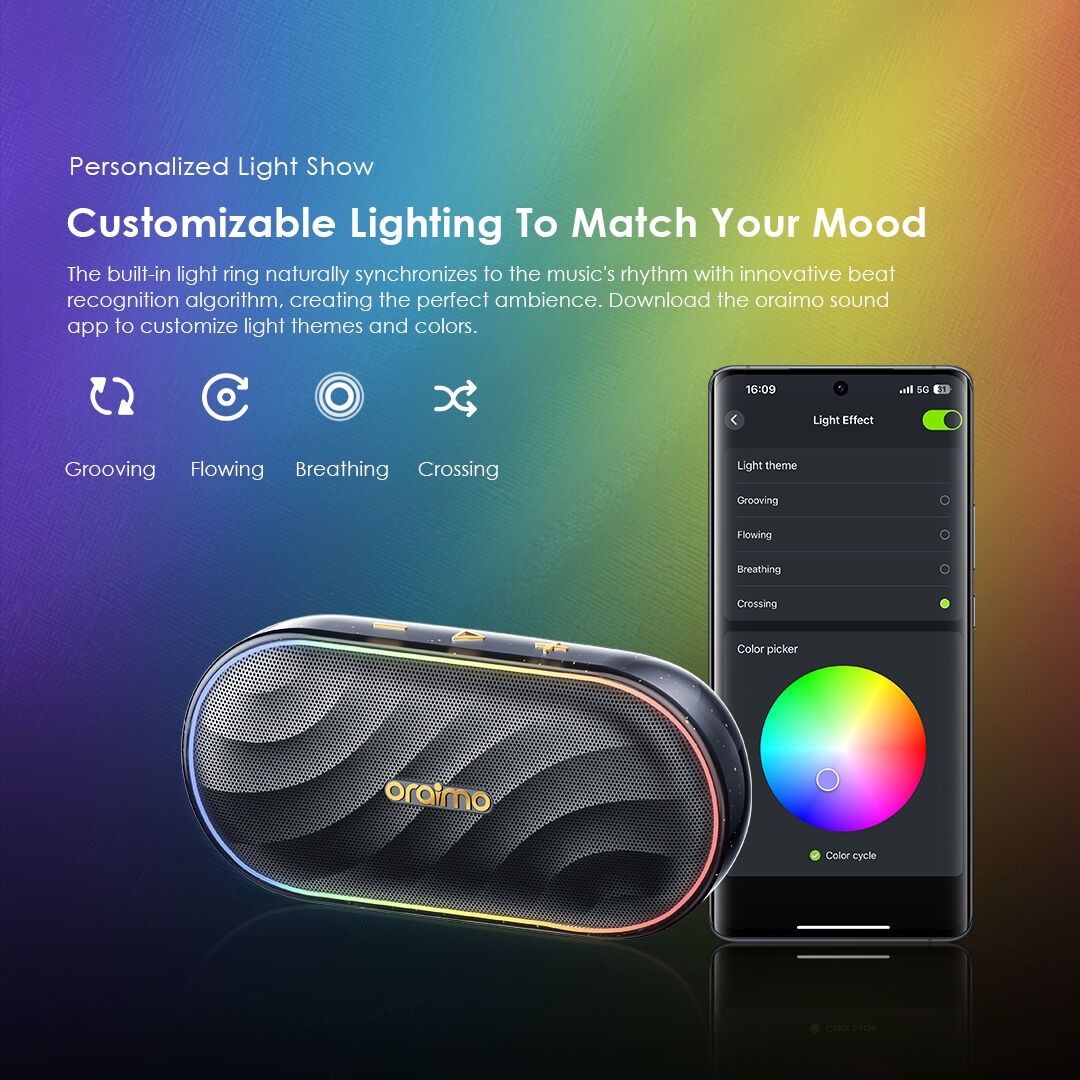 The built-in light ring naturally synchronizes to the music's rhythm with innovative beat recognition algorithm, creating the perfect ambiance. Download the oraimo sound App to customize light themes and colors.