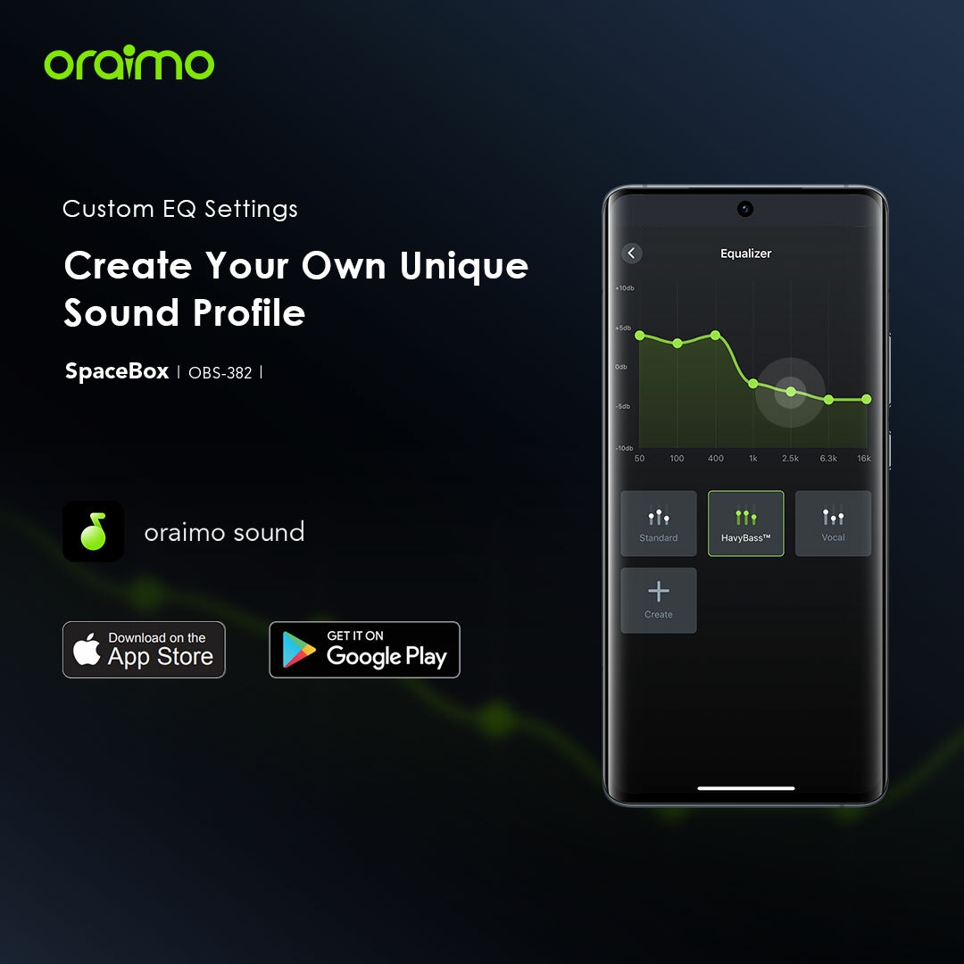 Select from preset EQ settings—Standard, HavyBass™, and Vocal—or customize your bass, mids, and treble with oraimo sound app.
