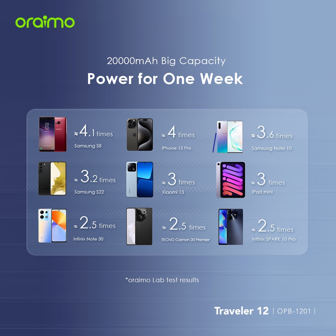 Compatible with Samsung and more devices, the oraimo Traveler 12 your multitasking lifestyle with triple outputs.