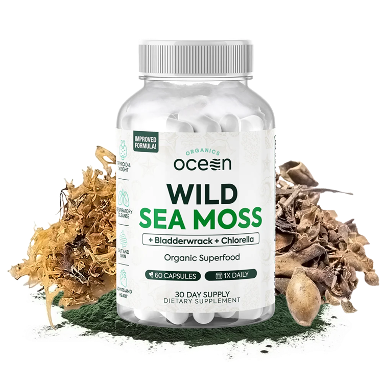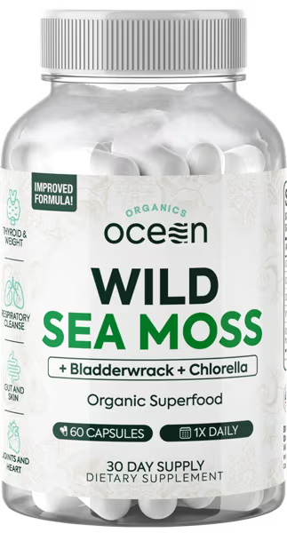 Elevate your well-being with Organics Ocean's Wild Crafted Sea Moss–an organic and dynamic blend of mineral-dense Irish sea moss and bladderwrack, antioxidant-rich chlorella, and vitamin D3. This unparalleled combination is designed to fue your energy, detoxify, and fortify your immunity and overall well-being. We've enriched our organic Irish sea moss capsules even further with bladderwrack to keep the body free of unwanted gunk. Hailed as the "Miracle of the Sea," our sea moss advanced superfood contains an impressive 92 out of 102 essential minerals to support hydration and help nurture a balanced skin microbiome, while it also functions as a thyroi support supplement and lung detox support. It's a holistic approach to wellne that sets us apart. Sourced from the pristine waters of the Atlantic Ocean, our sea moss is organically cultivated, offering more minerals and absolutely no additives. We meticulously monitor our supply chain, delivering superior quality with maximum efficiency.