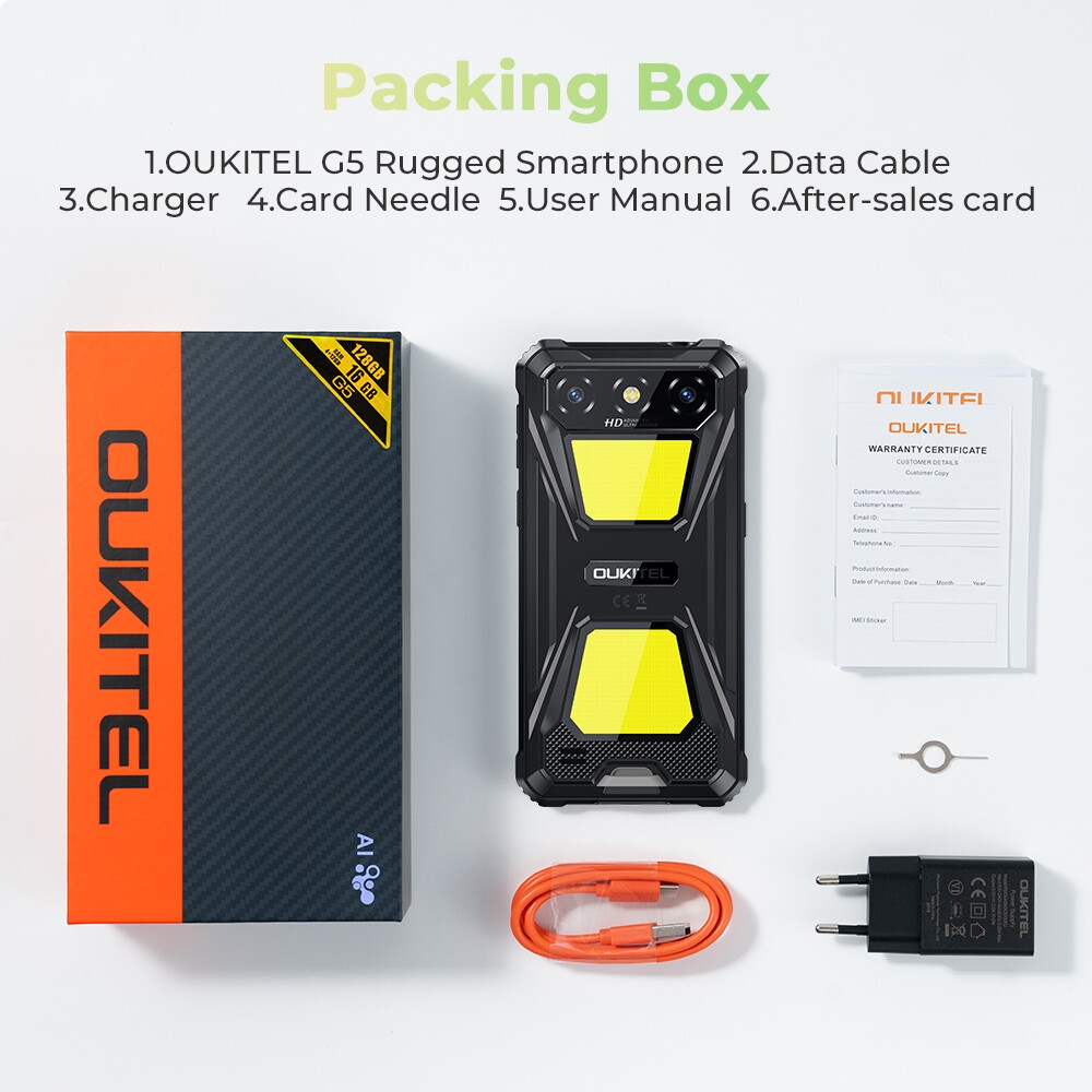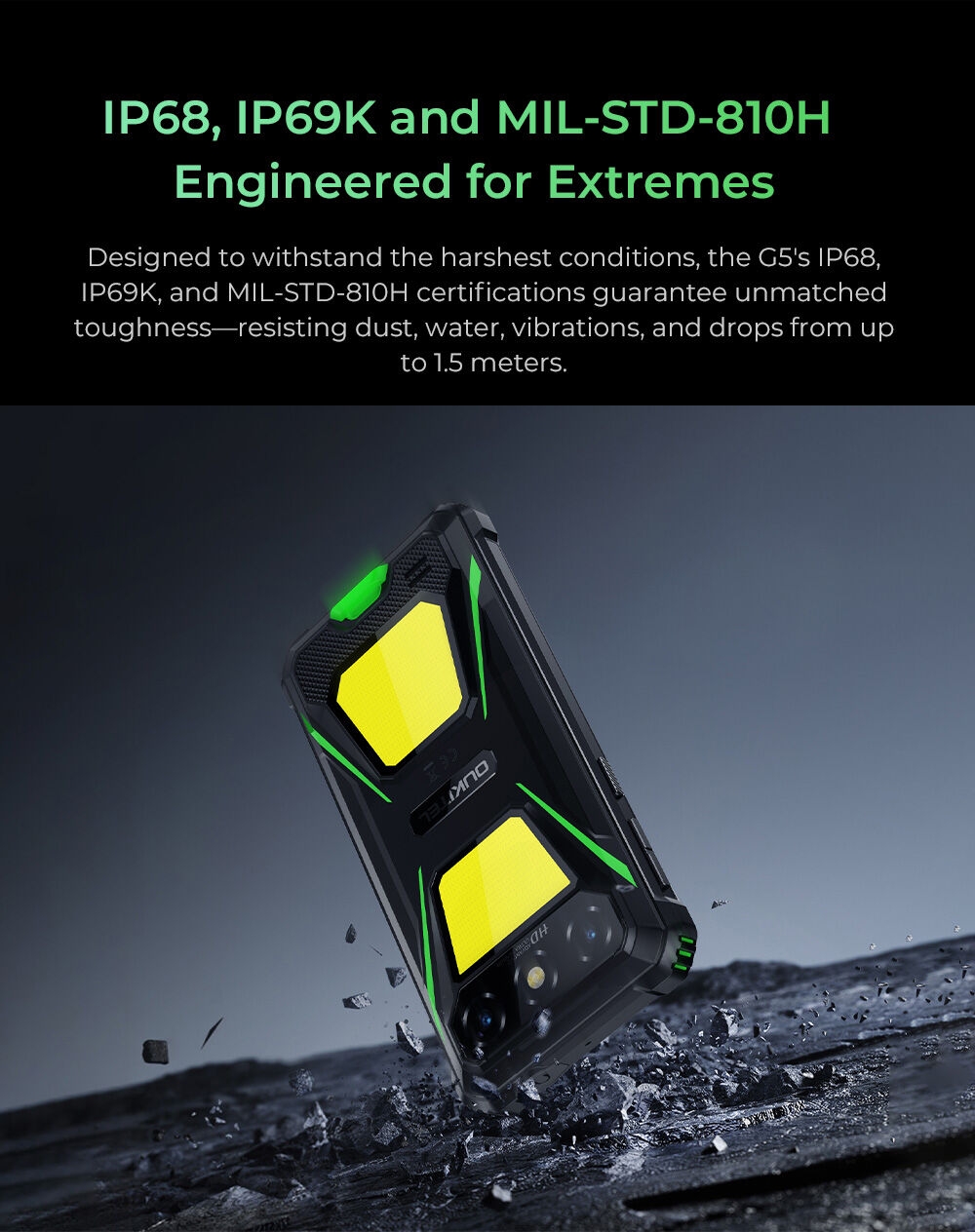 【IP68/IP69K/MIL-STD-810H, Waterproof, Shockproof and Dust-proof】Oukitel G5 rugged phone waterproof up to 1.5 meters for 30 minutes, perfect for surviving heavy rain or accidental submersion, also for dusty construction sites or sandy environments.