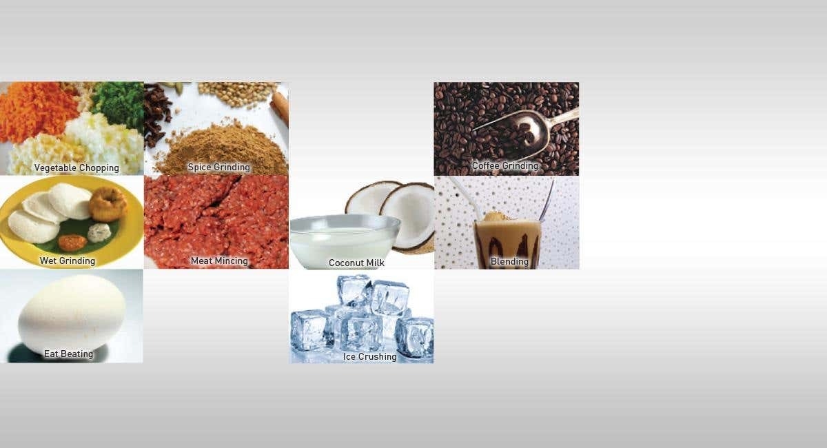 Food Processing: Vegetable Chopping, Spice Grinding, Meat Mincing, Wet Grinding, Egg Beating