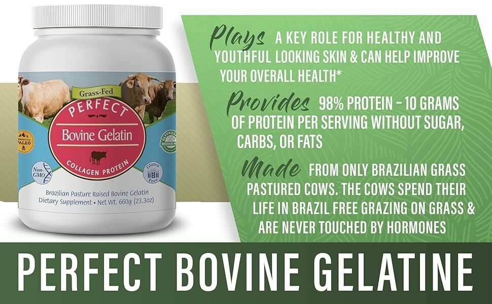 While we love bone broth, it can sometimes be hard to work enough bone broth into your diet. Our Perfect Bovine Gelatin allows you to easily get the nutrients of collagen via an all natural, Brazilian pasture raised and grass-fed source.