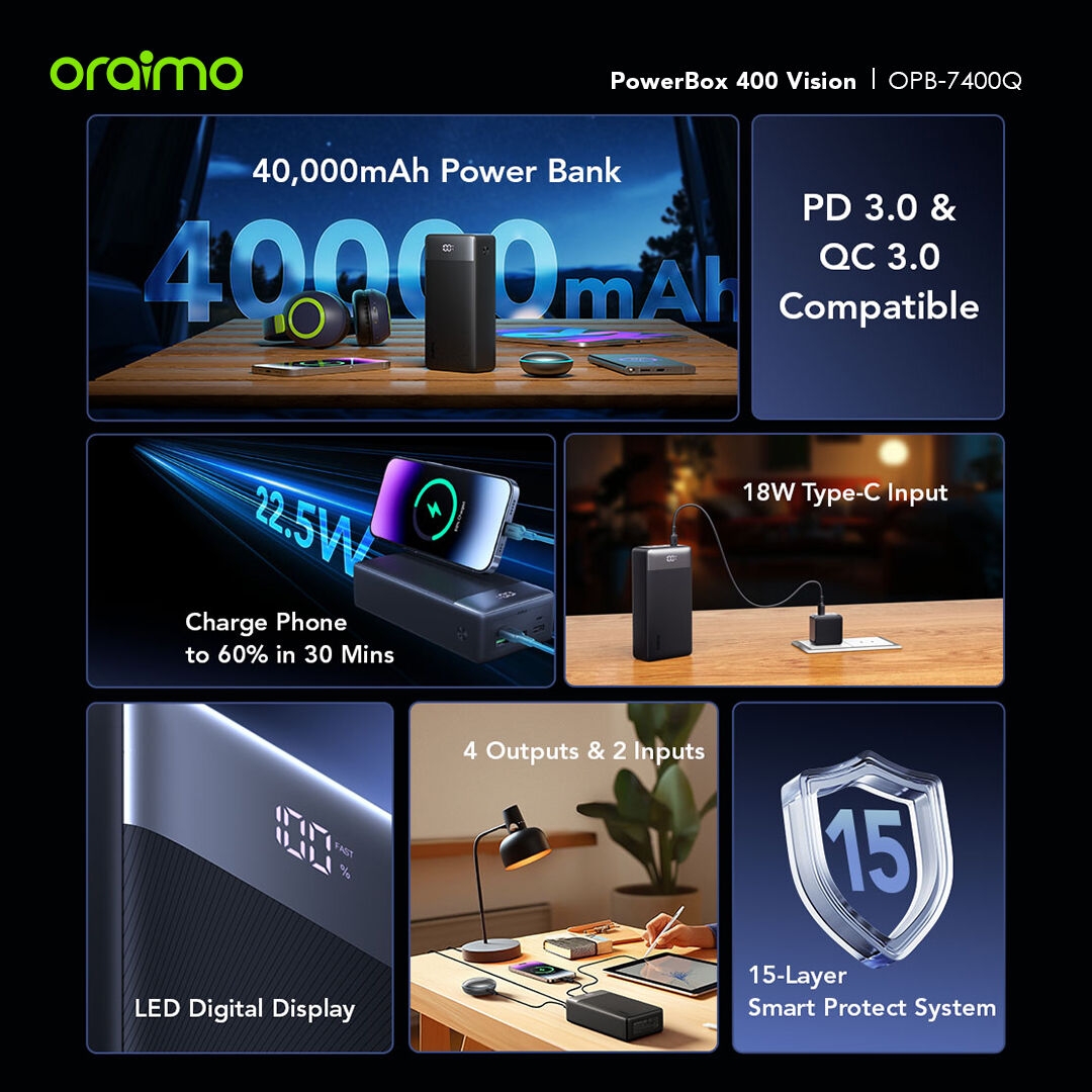 With its impressive 40,000mAh capacity, this power bank can fully charge your phone up to 8 times, and provide extended power for laptops, tablets, and other high-powered devices.
