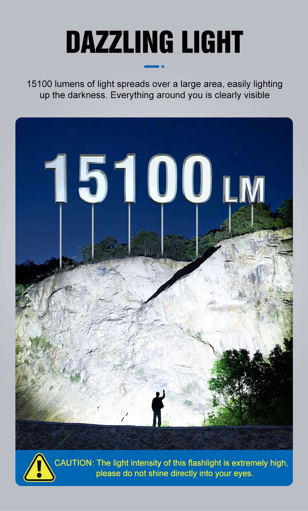 Ultra-Bright 15100 Lumens Output: Equipped with high-performance LED, delivering a blinding 15100LM brightness that turns night into day. Perfect for security patrols, search and rescue, and outdoor hunting.