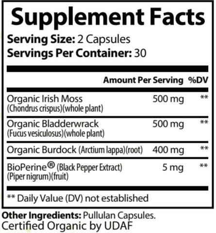 - TRIPLE ACTION SUPERFOOD SUPPLEMENT - The ultimate superfood trifecta! Each capsule provides 250mg of organic Irish moss, 250mg of bladderwrack, and 200mg of burdock. These three ingredients form a powerful antioxidant shield that fortifies your cells against free radical damage!