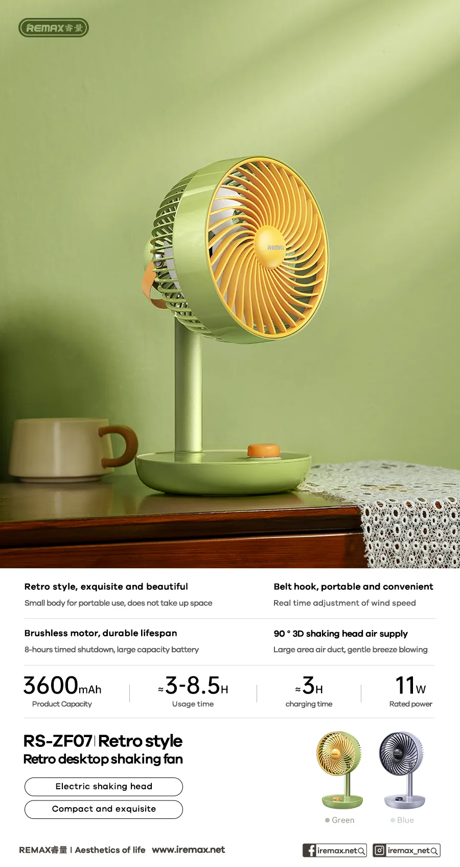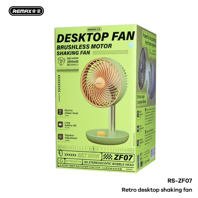 Remax RS-ZF07 Retro Desktop Shaking Fan. It features a brushless motor and a 3600mAh high-volume battery. The fan offers a 90-degree 3D shaking head (oscillation) for air supply. Key functions include stepless adjustment and an 8-hour timed shutdown function. The design is retro-styled, space-saving, and includes a belt hook for portability.