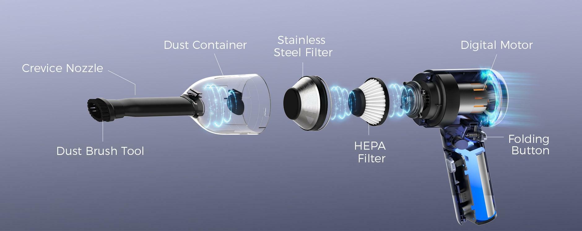 Unlike many hand vacuum cleaners with an only HEPA filter - this hand vacuum comes with a 2-stage filtration system. The Outer stainless filter of this small handheld vacuum could separate big dirt, and the inner Hepa filter could remove small dust and ashes. Both are easily detachable and washable, which make the lifespan of the vacuum even longer.
