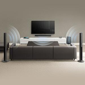 Seamless Streaming with NFC and Bluetooth TechnologySound Bar Type 5.1 ch Tall Boy Home Theatre HT-RT40 comes with total power output and 5.1 ch real cinematic surround sound effect. You can choose between Wall Mount or Table Top Design to add aesthetics to your living room. The Tall-boy rear speakers immerse you deeper in the movies you love with real surround sound. | Clean and Easy Set UpHT-RT40 is almost ready to go, straight out of the box. Only 3 speaker cable allows you to keep things neat and tidy. The tall boy speakers are easy to place for perfect surround positioning. | 5.1 Channel Dolby Digital Surround SoundGet the best seat in the house! A three channel soundbar, subwoofer and powerful tall-boy rear speakers create authentic cinema surround sound. | Perfect Music Companion with USBCarry your favorite music in USB or in your Smartphone. Play your favorite songs by ju |