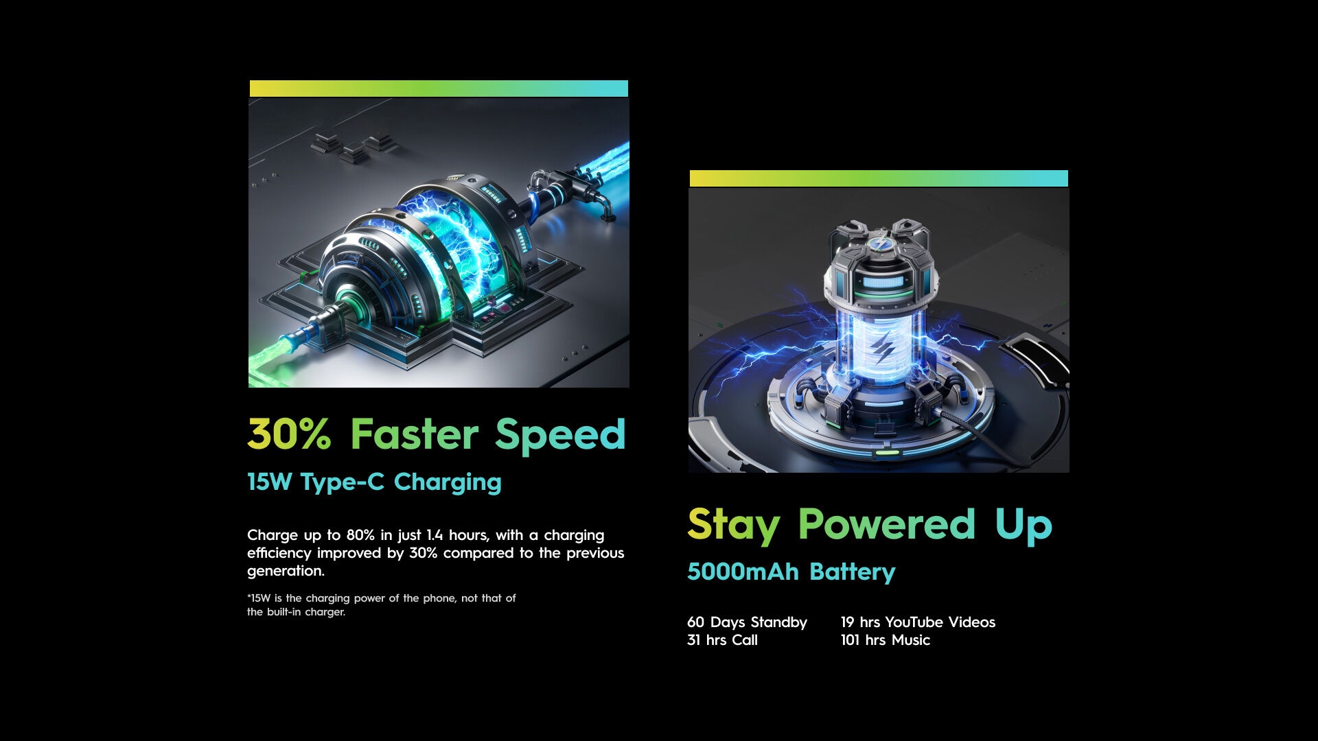 The front camera has a 8 MP sensor. The smartphone is fueled by a Non-removable Li-Ion 5000 mAh battery + 10W wired while the phone runs on Android T Go operating system.