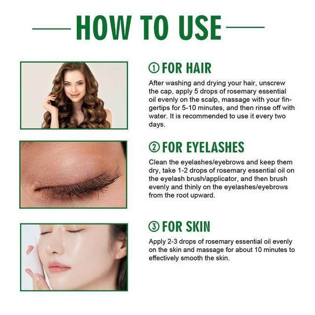 Clean the eyelashes/eyebrows and keep themdry, take 1-2 drops of rosemary essential oil onthe eyelash brush/applicator, and then brushevenly and thinly on the eyelashes/eyebrowsfrom the root upward.