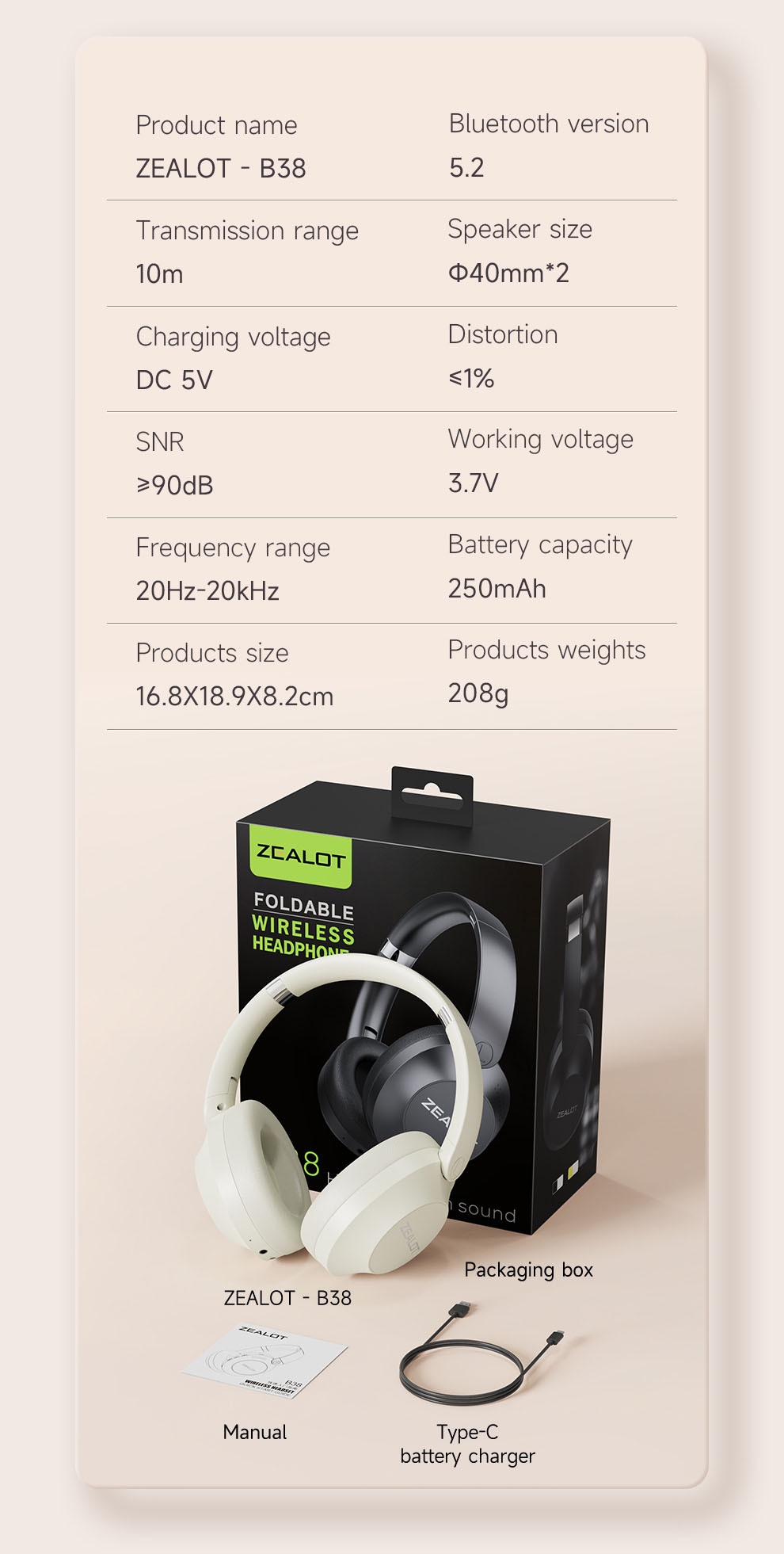 Key FeaturesBattery capacity: 250mAhBluetooth version: 5.2Speaker: φ 40mm * 2Transmission distance: 10mFrequency response: 20Hz-20KHzSignal to noise ratio: ≥ 90dBWorking voltage: 3.7VDistortion: <1%Charging voltage: DC5VCharging interface: type-cBluetooth playback: 10hCharging time: 3h