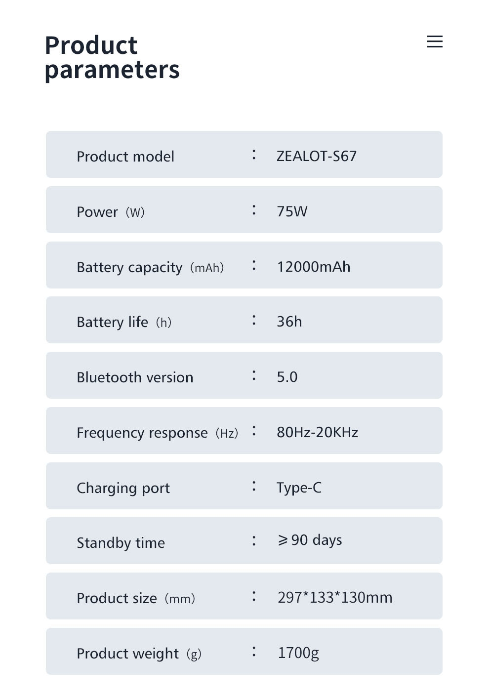 Key FeaturesInput voltage: 5V/2ATransmission distance: 10mFrequency response: 20HZ-20KHZSignal to noise ratio: ≥90dBWorking voltage: 7.4VDistortion: 1%Charging interface: Type-CPlaying time: 12hStandby time: ≥90 daysCharging time: 6-10HSpeaker:60WSize:311*156*155mm