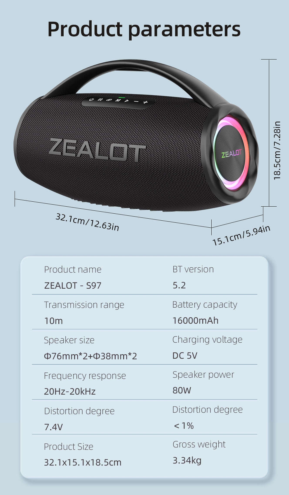 Zealot S97 Portable Speaker, 80W Loud with Booming Bass, IP67 Waterproof, Bluetooth 5.2 - BLACK₦ 108,900₦ 198,50045%Add to cart