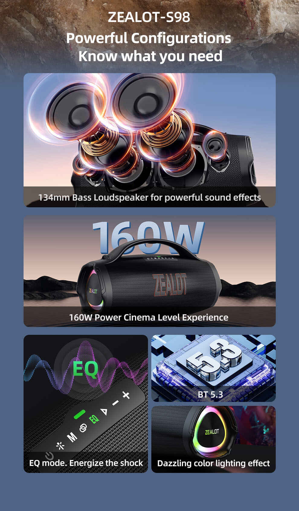 The Zealot S98 has a 134mm full-range driver with a total output power of 160W (root mean square), specifically tuned for music, making bass clearer and more transparent.