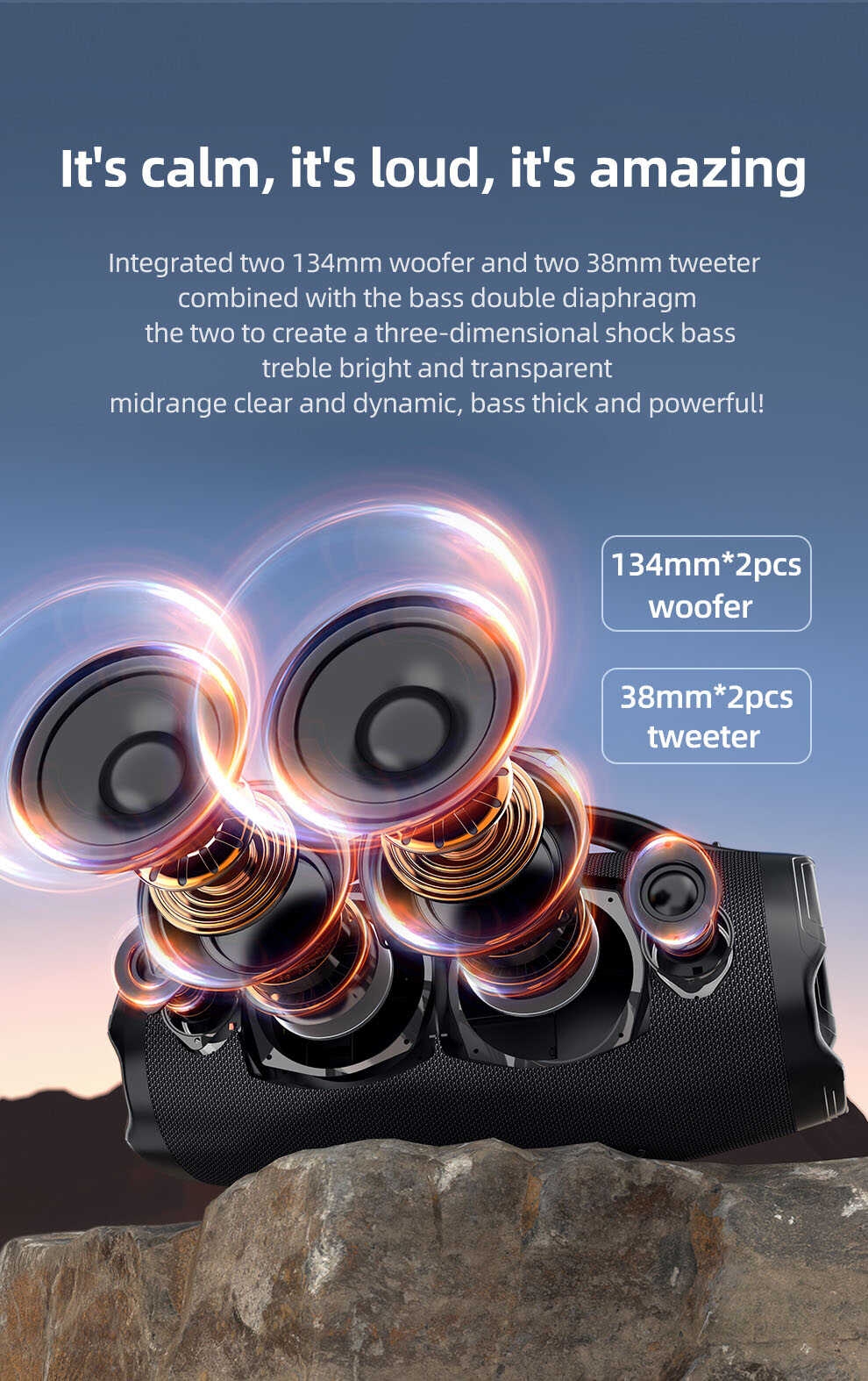 • Monstrous Sound of Bluetooth Speaker: ZEALOT S98 wireless speaker has 4 drivers with 160W RMS(200W PEAK ) power. It present extreme dynamic and powerful bass and treble, providing an immersive listening experience. With the latest DSP technology & BT5.3 chip, You can feel the incredible sound with thunderous bass.