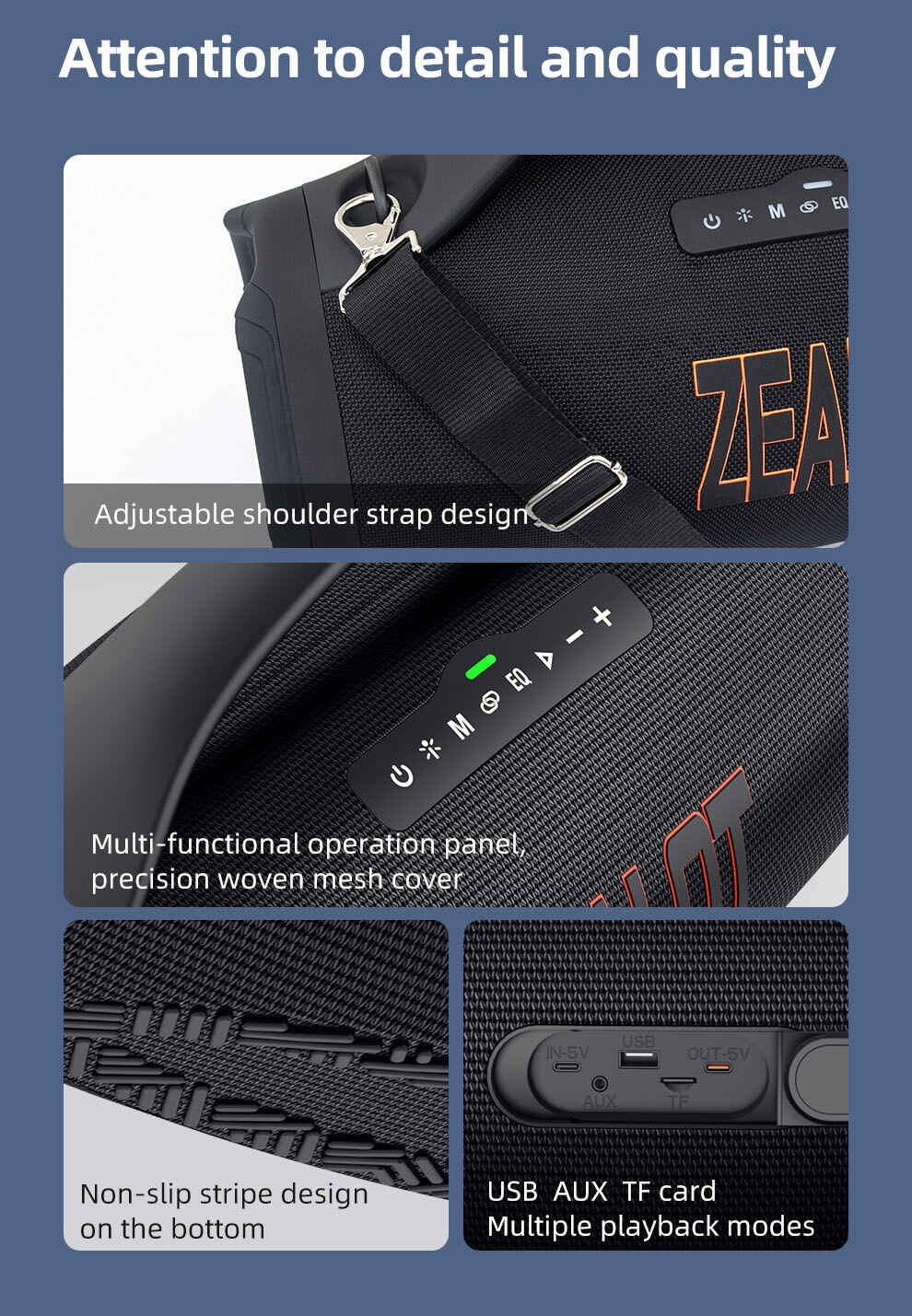 • Mulitple Playmodes/Comstomized EQ modes: This bluetooth speaker features BT/USB/ TF card/ line-in 4 playmodes. You can play the music as you like. It also has 3 comtomized EQ models(deep bass/ vocal/ balanced) to meet your preference. Anywhere you’re, the music is always be your side.